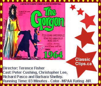 THE GORGON (1964) A mysterious monster is turning people to stone in a German village in 1910. When his girlfriend is killed, Bruno (Jeremy Longhurst) becomes the prime suspect. His ensuing suicide seems to confirm his guilt, but professor Carl Maister (Christopher Lee) isn't so sure. He thinks one of the villagers is possessed by the spirit of Megaera, sister to Medusa. Among the possible culprits are Dr. Namaroff (Peter Cushing), gorgeous nurse Carla (Barbara Shelley) and a mental patient. Director: Terence Fisher. Cast: Peter Cushing, Christopher Lee, Richard Pasco and Barbara Shelley. |