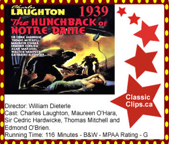 THE HUNCHBACK OF NOTRE DAME (1939) King Louis XI is a wise and old king and Frollo is the Chief Justice. Frollo gazes on the gypsy girl, Esmeralda, in the church during Fool's Day and sends Quasimoto to catch her. Quasimoto, with the girl, is captured by Phoebus, Captain of the Guards, who frees the girl. The courts sentence Quasimoto to be flogged, and the only one who will give him water while he is tied in the square is Esmeralda. Later, at a party of nobles, Esmeralda again meets both Frollo, who is bewitched by her, and Phoebus. When Phoebus is stabbed to death, Esmeralda is accused of the murder, convicted by the court and sentenced to hang. Clopin, King of the Beggars, Gringoire the Husband of Esmeralda, and Quasimoto, the bellringer, all try different ways to save her from the gallows. Director: William Dieterle. Cast: Charles Laughton, Maureen O'Hara, Sir Cedric Hardwicke, Thomas Mitchell and Edmond O'Brien. |