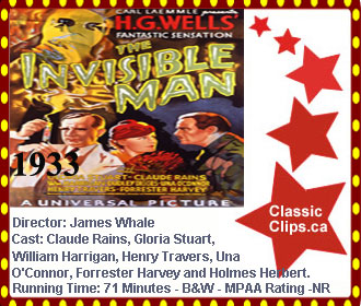 THE INVISIBLE MAN (1933) On a snowy night, a stranger, his face swathed in bandages and his eyes obscured by dark goggles, takes a room at The Lion's Head Inn in the English village of Iping in Sussex. The man demands that he be left alone. Later, the innkeeper, Mr. Hall, is sent by his wife to evict the stranger after he makes a huge mess in his room while doingresearch and falls behind on his rent. Angered, the stranger throws Mr. Hall down the stairs. Confronted by a policeman and some local villagers, he removes his bandages and goggles, revealing that he is invisible. Laughing maniacally, he takes off his clothes, making himself completely undetectable, and drives off his tormenters before fleeing into the countryside, intoxicated with the knowledge and prospect of wielding his will and authority over mankind. Director: James Whale. Cast: Claude Rains, Gloria Stuart, William Harrigan, Henry Travers, Una O'Connor, Forrester Harvey and Holmes Herbert. |