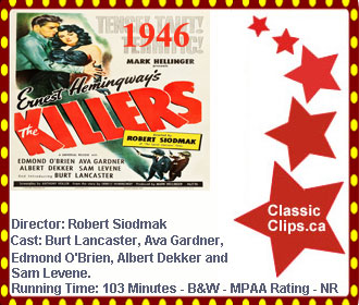 THE KILLERS (1946) Two hit men walk into a diner asking for a man called "the Swede" (Burt Lancaster). When the killers find the Swede, he's expecting them and doesn't put up a fight. Since the Swede had a life insurance policy, an investigator (Edmond O'Brien), on a hunch, decides to look into the murder. As the Swede's past is laid bare, it comes to light that he was in love with a beautiful woman (Ava Gardner) who may have lured him into pulling off a bank robbery overseen by another man (Albert Dekker). Director: Robert Siodmak. Cast: Burt Lancaster, Ava Gardner, Edmond O'Brien, Albert Dekker and Sam Levene. |
