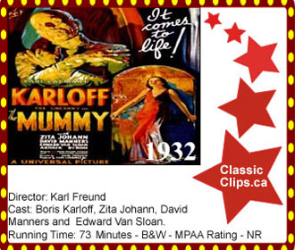 THE MUMMY (1932) Brought back to life after nearly 3,700 years, Egyptian high priest Imhotep wreaks havoc upon the members of a British field exposition. While disguised as a contemporary Egyptologist, he falls in love with Zita Johann, whom he recognizes as the incarnation of a priestess who died nearly 40 centuries earlier. Director: Karl W. Freund. Cast: Boris Karloff, Zita Johann, David Manners, Edward Van Sloan and Arthur Byron. |