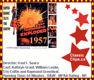 THE NIGHT THE WORLD EXPLODED (1957) Dr. Conway (William Leslie) has perfected a machine that predicts earthquakes, and has determined that one will strike California within 24 hours while a computer analysis determines that the entire world could explode within a little more than 28 days. Director: Fred F. Sears. Cast: William Leslie, Kathryn Grant, Tris Coffin and Raymond Greenleaf. |