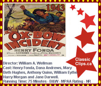 THE OX-BOW INCIDENT (1943) Wanderers Gil Carter (Henry Fonda) and Art Croft (Henry Morgan) ride into a small Nevada town plagued by cattle thieves. Initially suspected of being the rustlers themselves, Carter and Croft eventually join a posse out to get the criminals, who also may be involved in a recent shooting. When the posse closes in on a group that could be the fugitives, they must decide on a course of action, with numerous lives hanging in the balance. Director: William A. Wellman. Cast: Henry Fonda, Dana Andrews, Mary Beth Hughes, Anthony Quinn, William Eythe, Harry Morgan and Jane Darwell.. |