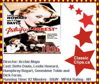 THE PETRIFIED FOREST (1936) A drifter, a waitress and a notorious gangster cross paths in the Petrified Forest region of Arizona. Alan (Leslie Howard), a destitute writer, goes into the diner where Gabrielle (Bette Davis) works. Gabrielle dreams of studying art, and she and Alan connect as they talk about Europe and she tells him her ambitions. But gangster Duke Mantee (Humphrey Bogart) shows up and takes the customers hostage. Director: Archie Mayo. Cast: Bette Davis, Leslie Howard, Humphrey Bogart, Genevieve Tobin and Dick Foran. |