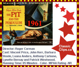 THE PIT AND THE PENDULUM (1961) Elizabeth Barnard Medina (Barbara Steele) has died in the prime of life, and her brother, Francis (John Kerr), wants to know why. Elizabeth's husband, Nicholas (Vincent Price), and her doctor offer differing explanations, but when Francis learns that Nicholas' mother may have been buried alive, he begins to wonder if his sister met the same fate. And when he comes to believe that Elizabeth's spirit wanders about Nicholas' castle, Francis investigates -- and is stunned by what he finds. Director: Roger Corman. Cast: Vincent Price, John Kerrr, Barbara Steele, Luana Anders, Anthony Carbone, Lynette Bernay and Patrick Westwood. |
