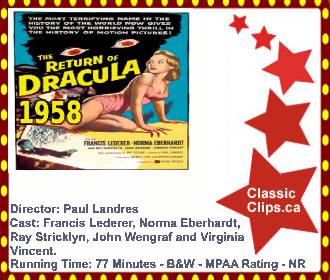THE RETURN OF DRACULA (1958) After a vampire leaves his native Balkans, murders a Czech artist, assumes his identity, and moves in with the dead man's American cousins in California, a visit they will not soon forget. Director: Paul Landres. Cast: Francis Lederer, Norma Eberhardt, Ray Stricklyn, John Wengraf and Virginia Vincent. |