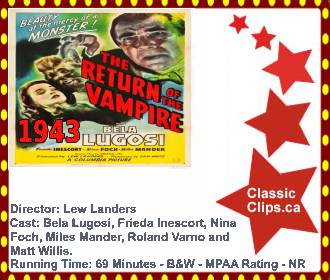 THE RETURN OF THE VAMPIRE (1943) When an errant bomb unearths the coffin of a vampire during the London Blitz, a gravedigger unknowingly reanimates the monster by removing the stake from his heart. Director: Lew Landers. Cast: Bela Lugosi, Frieda Inescort, Nina Foch, Miles Mander, Roland Varno and Matt Willis. |