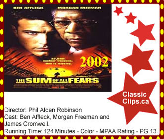 THE SUM OF ALL FEARS (2002) The President of Russia dies and is replaced by a man with a cryptic past placing the United States on red alert. When the CIA suspects that renegade Russian scientists are attempting to develop more mobile nuclear weapons, East-West tensions overflow. CIA director William Cabot (Morgan Freeman) then sends his best agent, Jack Ryan (Ben Affleck) into action. Ryan discovers that terrorists are planning to provoke a war between the U.S. and Russia by detonating a nuclear bomb at a football game in Baltimore. Director: Phil Alden Robinson. Cast: Ben Affleck, Morgan Freeman and James Cromwell.. |