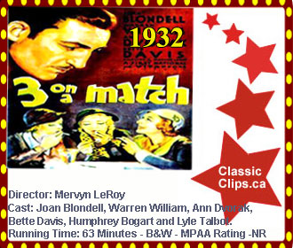 THREE ON A MATCH (1932) Mary (Joan Blondell), Vivian (Ann Dvorak) and Ruth (Bette Davis) are old friends who do some catching up after a chance meeting. Of the three women, Vivian, who married successful lawyer Robert (Warren William), seems to have the most glamourous life. Vivian really isn't satisfied, though, and she soon deserts Robert and her son for Mike (Lyle Talbot), a mobster. Before long, Vivian is hooked on drugs, and Mike needs cash - so the gangster decides to kidnap Vivian's ownson for ransom. Director: Mervyn LeRoy. Cast: Joan Blondell, Warren William, Ann Dvorak, Bette Davis, Humphrey Bogart and Lyle Talbot . |