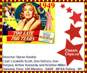 TOO LATE FOR TEARS (1949) A woman (Lizabeth Scott) kills her husband and plots with a private eye (Dan Duryea) after someone tosses a moneybag into her car. Director: Byron Haskin. Cast: Lizabeth Scott, Don DeFore, Dan Duryea, Arthur Kennedy and Kristine Miller. |