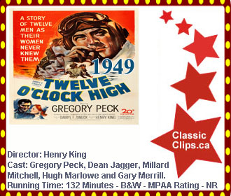TWELVE O'CLOCK HIGH (1949) In 1942, an American Air Force unit stationed in England is plagued with morale problems until no-nonsense Brigadier General Frank Savage (Gregory Peck) assumes command. His tough leadership is initially resented by not only his pilots but his second-in-command (Hugh Marlowe), a West Point graduate and son of a general. But, with the help of a hotshot flying ace (Robert Patten) and a sympathetic administrator (Dean Jagger), the unit pulls together into a gung-ho fighting crew. Director: Henry King. Cast: Gregory Peck, Dean Jagger, Millard Mitchell, Hugh Marlowe and Gary Merrill. |