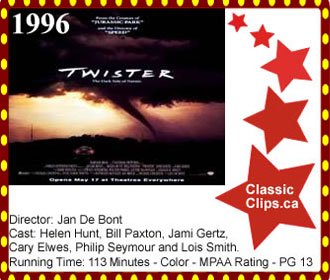 TWISTER (1996) Bill Harding, a TV weatherman, trys to get his tornado-hunter wife, Jo, to sign divorce papers so he can marry his girlfriend Melissa. But Mother Nature, in the form of a series of intense storms sweeping across Oklahoma, has other plans. Soon the three join the team of stormchasers as they attempt to insert a revolutionary measuring device into the very heart of several extremely violent tornados. Director: Jamn De Bont. Cast: Helen Hunt, Bill Paxton, Jami Gertz, Cary Elwes, Philip Seymour and Lois Smith. |
