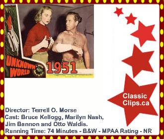 UNKNOWN WORLD (1951) To show that mankind could survive from a nuclear blast, Dr Jeremiah builds the `cyclotram' to burrow into the earth's surface. With the bunker's atmosphere making anyone within it sterile, they begin the dangerous journey back to the surface. Director: Terrell O. Morse. Cast: Bruce Kellogg, Marilyn Nash, Jim Bannon and Otto Waldis. |