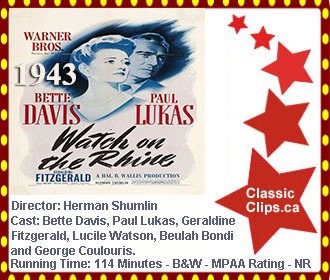 WATCH ON THE RHINE (1943) Anti-Fascist German engineer Kurt Muller (Paul Lukas), with his American-born wife, Sara (Bette Davis), and their three children, returns to the United States in 1940 after spending 17 years in Europe, where Kurt has engaged in underground resistance to the rising Nazi threat. Unscrupulous Romanian count Teck de Brancovis (George Coulouris), a houseguest of Sara's family in Washington, D.C., discovers Kurt's secret and threatens to expose his activities to his contacts at the German embassy. Director: Herman Shumlink. Cast: Bette Davis, Paul Lukas, Geraldine Fitzgerald, Lucile Watson, Beulah Bondi and George Coulouris. |