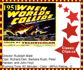 WHEN WORLDS COLLIDE (1951) A group of astronomers calculate a star is on a course to slam into Earth, but a few days before, it's accompanying planet will first pass close enough to the Earth to cause havoc on land and sea. Scientists then set about building a rocket so a few selected individuals can escape the doomed planet. Director: Rudolph Maté . Cast: Richard Derr, Barbara Rush, Peter Hansen and John Hoyt. |