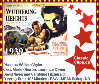 WUTHERING HEIGHTS (1939) In this adaptation of the classic Emily Bronte novel set in 19th-century England, wealthy young Cathy Earnshaw (Merle Oberon) shares a loving bond with Heathcliff (Laurence Olivier), a poor childhood friend who now works in her stables. Unfortunately, things become complicated when the affluent Edgar Linton (David Niven) decides to pursue Cathy, and Heathcliff leaves out of resentment. Though Heathcliff returns with a self-made fortune, he realizes he may have lost Cathy in his absence. Director: William Wyler. Cast: Merle Oberon, Laurence Olivier, David Niven and Geraldine Fitzgerald. |