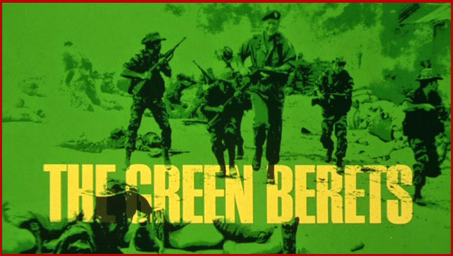 The Green Berets is strongly anti-communist and pro-South Vietnam. It was released at the height of American involvement in the Vietnam War, the same year as the Tet Offensive against the largest cities in South Vietnam. John Wayne was so concerned by the anti-war sentiment in the United States, he wanted to make this film to present the pro-military position. He requested and obtained full military cooperation and materiel from 36th President Lyndon B. Johnson and the United States Department of Defense. John Wayne bought out Robin Moore for $35,000 and 5% of undefined profits of the film. - Source Wikipedia