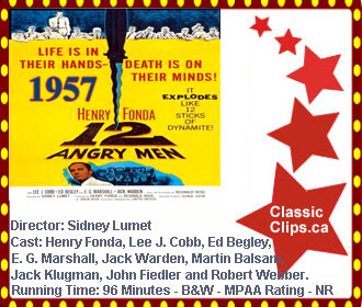 12 ANGRY MEN (1957) Following the closing arguments in a murder trial, the 12 members of the jury must deliberate, with a guilty verdict meaning death for the accused, an inner-city teen. As the dozen men try to reach a unanimous decision while sequestered in a room, one juror (Henry Fonda) casts considerable doubt on elements of the case. Personal issues soon rise to the surface, and conflict threatens to derail the delicate process that will decide one boy's fate. Director: Sidney Lumet. Cast: Henry Fonda, Lee J. Cobb, Ed Begley, E. G. Marshall, Jack Warden, Martin Balsam, Jack Klugman. John Fiedler and Robert Webber. |