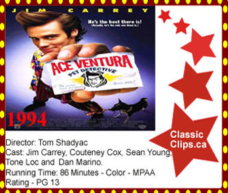 ACE VENTURA - PET DETECTIVE (1994) He's the best there is. In fact, he's the only one there is! He's Ace Ventura: Pet Detective. Ace is on the case to find the Miami Dolphins' missing mascot and quarterback Dan Marino. He goes eyeball to eyeball with a man-eating shark, stakes out the Miami Dolphins and woos and wows the ladies. Whether he's undercover, under fire or underwater, he always gets his man . . . or beast! Director: Tom Shadyac. Cast: Jim Carrey, Courteney Cox, Sean Young, Tone Loc and Dan Marino. |