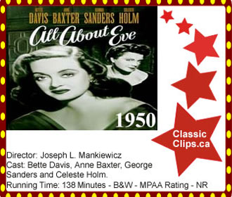 ALL ABOUT EVE (1950) Aspiring actress Eve Harrington (Anne Baxter) maneuvers her way into the lives of Broadway star Margo Channing (Bette Davis), playwright Lloyd Richards and director Bill Sampson. This classic story of ambition and betrayal has become part of American folklore. Bette Davis claims to have based her character on the persona of film actress Talullah Bankhead. Davis' line "Fasten your seatbelts, it's going to be a bumpy night" is legendary, but, in fact, all of the film's dialog sparkles with equal brilliance. Director: Joseph L. Mankiewicz. Cast: Bette Davis, Anne Baxter, George Sanders and Celeste Holm. |