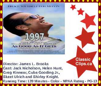 AS GOOD AS IT GETS (1997) Melvin Udall (Jack Nicholson) is an obsessive-compulsive writer of romantic fiction who's rude to everyone he meets, including his gay neighbor Simon (Greg Kinnear), but when he has to look after Simon's dog, he begins to soften and, if still not completely over his problems, finds he can conduct a relationship with the only waitress (Helen Hunt) at the local diner who'll serve him. Director: James L. Brooks. Cast: Jack Nicholson, Helen Hunt, Greg Kinnear, Cuba Gooding Jr., Skeet Ulrich and Shirley Knight. |