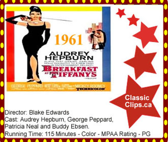 BREAKFAST AT TIFFANY'S (1961) Struggling writer Paul Varjak moves into a New York apartment building and becomes intrigued by his pretty, quirky neighbor Holly Golightly. Holly's lifestyle confuses and fascinates Paul; in public she flits through parties with a sexy, sophisticated air, but when they're alone she changes into a sweetly vulnerable bundle of neurosis. Director: Blake Edwards. Cast: Audrey Hepburn, George Peppard, Patricia Neal and Buddy Ebsen. |