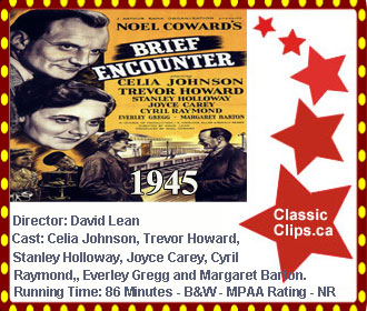 BRIEF ENCOUNTER (1945) Returning home from a shopping trip to a nearby town, bored suburban housewife Laura Jesson (Celia Johnson) is thrown by happenstance into an acquaintance with virtuous doctor Alec Harvey (Trevor Howard). Their casual friendship soon develops during their weekly visits into something more emotionally fulfilling than either expected, and they must wrestle with the potential havoc their deepening relationship would have on their lives and the lives of those they love. Director: David Lean. Cast: Celia Johnson, Trevor Howard, Stanley Holloway, Joyce Carey, Cyril Raymond, Everley Gregg and Margaret Barton. |