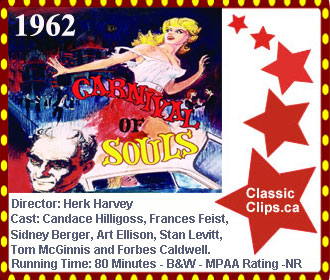 CARNIVAL OF SOULS (1962) Mary Henry (Candace Hilligoss) ends up the sole survivor of a fatal car accident through mysterious circumstances. Trying to put the incident behind her, she moves to Utah and takes a job as a church organist. But her fresh start is interrupted by visions of a fiendish man (Herk Harvey). As the visions begin to occur more frequently, Mary finds herself drawn to the deserted carnival on the outskirts of town. The strangely alluring carnival may hold the secret to her tragic past. Director: Herk Harvey. Cast: Candace Hilligoss, Frances Feist, Sidney Berger, Art Ellison, Stan Levitt, Tom McGinnis and Forbes Caldwell. |