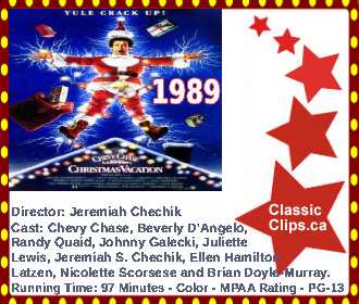NATIONAL LAMPOON'S CHRISTMAS VACATION (1989) As the holidays approach, Clark Griswold (Chevy Chase) wants to have a perfect family Christmas, so he pesters his wife, Ellen (Beverly D'Angelo), and children, as he tries to make sure everything is in line, including the tree and house decorations. However, things go awry quickly. His hick cousin, Eddie (Randy Quaid), and his family show up unplanned and start living in their camper on the Griswold property. Even worse, Clark's employers renege on the holiday bonus he needs. Director: Jeremiah Chechik. Cast: Chevy Chase, Beverly D'Angelo, Randy Quaid, Johnny Galecki, Juliette Lewis, Jeremiah S. Chechik, Ellen Hamilton Latzen, Nicolette Scorsese and Brian Doyle-Murray. |