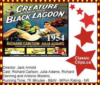 CREATURE FROM THE BLACK LAGOON (1954) A scientific expedition searching for fossils along the Amazon River discover a prehistoric Gill-Man in the legendary Black Lagoon. The explorers capture the mysterious creature, but it breaks free. The Gill-Man returns to kidnap the lovely Kay, fiancée of one of the expedition, with whom it has fallen in love. Director: Jack Arnold. Cast: Richard Carlson, Julia Adams, Richard Denning and Antonio Moreno. |