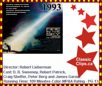 FIRE IN THE SKY (1993) In 1975, a group of five men are driving home after working in a forest when they see a mysterious light. Intrigued, Travis Walton (D.B. Sweeney) leaves the truck -- only to be sucked up by a flying saucer. The other four men report the strange event, but they are skeptically interrogated by Lt. Frank Watters (James Garner), who suspects that murder is behind Walton's disappearance. When Walton reappears five days later, his story of alien abduction is met with disbelief. Director: Robert Lieberman. Cast: D. B. Sweeney, Robert Patrick, Craig Sheffer, Peter Berg and James Garner. |