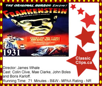 FRANKENSTEIN (1931) Dr. Frankenstein creates a monster from various posthumous 'donors' and combines them into a massive creature, to whom he wishes to bestow life. The movie centers on this monster and his struggle in this 'life after death'. Director: James Whale. Cast: Colin Clive, Mae Clarke, John Boles and Boris Karloff.. |