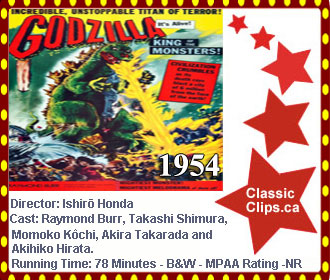 GODZILLA, KING OF THE MONSTERS! (1954) A 400-foot amphibious monster, brought back to life by underwater nuclear testing, goes on a rampage in a tinker-toy Tokyo. The authorities look on in vain as Godzilla proves more powerful than the army, navy, and air force, while paleontologiist Dr. Yemane (Takashi Shimura) rails against the destruction of a unique scientific find such as Godzilla. Finally, an enigmatic scientist (Akihiko Hirata) reluctantly steps forward to destroy the beast with his newly-discovered creation, the Oxygen Destroyer, dreading all the while that his weapon may unleash a danger even greater than Godzilla. Director: Ishirō Honda. Cast: Raymond Burr, Takashi Shimura, Momoko Kôchi, Akira Takarada and Akihiko Hirata . |