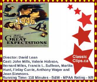GREAT EXPECTATIONS (1946) In this Dickens adaptation, orphan Pip (John Mills) discovers through lawyer Mr. Jaggers (Francis L. Sullivan) that a mysterious benefactor wishes to ensure that he becomes a gentleman. Reunited with his childhood patron, Miss Havisham (Martita Hunt), and his first love, the beautiful but emotionally cold Estella (Valerie Hobson), he discovers that the elderly spinster has gone mad from having been left at the altar as a young woman, and has made her charge into a warped, unfeeling heartbreaker.. Director: David Lean. Cast: John Mills, Valerie Hobson, Bernard Miles, Francis L. Sullivan, Martita Hunt, Finlay Currie, Anthony Wager and Jean Simmons. |