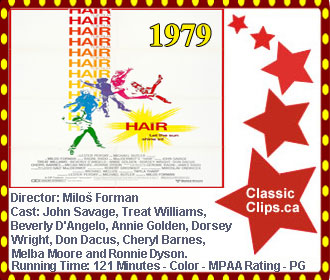 HAIR (1979) In New York City for the first time while on his way to enlist in the U.S. Army during the Vietnam War, Oklahoma farm hand Claude Hooper Bukowski (John Savage) meets up with a freewheeling group of Central Park hippies led by the irrepressible George Berger (Treat Williams). When the unlikely friends meet upper-middle-class debutante Sheila Franklin (Beverly D'Angelo), sparks fly between the country boy and the city girl, and Berger's troupe attempts to keep the young lovers together. Director: Miloš Forman. Cast: John Savage, Treat Williams, Beverly D'Angelo, Annie Golden, Dorsey Wright, Don Dacus, Cheryl Barnes, Melba Moore and Ronnie Dyson. |
