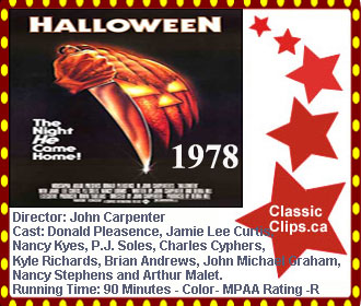 HALLOWEEN (1978) On a cold Halloween night in 1963, six year old Michael Myers brutally murdered his 17-year-old sister, Judith. He is sentenced and locked away for 15 years. But on October 30, 1978, while being transferred for a court date, the now 21-year-old Michael Myers steals a car and escapes the Smith's Grove insane asylum. He returns to his quiet hometown of Haddonfield, Illinois, where he looks for his next victims. Director: John Carpenter. Cast: Donald Pleasence, Jamie Lee Curtis, Nancy Kyes, P.J. Soles, Charles Cyphers, Kyle Richards, Brian Andrews, John Michael Graham, Nancy Stephens and Arthur Malet . |