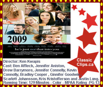 HE'S JUST NOT THAT INTO YOU (2009) Baltimore-based friends and lovers, all in their 20s and 30s, try to navigate their way through the complexities of modern relationships. Beth (Jennifer Aniston) wants commitment from Neil (Ben Affleck), who sees nothing wrong with the status quo. Gigi (Ginnifer Goodwin) is tired of waiting by the phone, while Mary (Drew Barrymore) has a slew of supportive male friends, none of whom are straight. Meanwhile, Janine has trust issues with her husband, who can't trust himself around Anna. Director: Ken Kwapis. Cast: Ben Affleck, Jennifer Aniston, Drew Barrymore, Jennifer Connelly, Kevin Connolly, Bradley Cooper, Ginnifer Goodwin, Scarlett Johansson, Kris Kristofferson and Justin Long. |