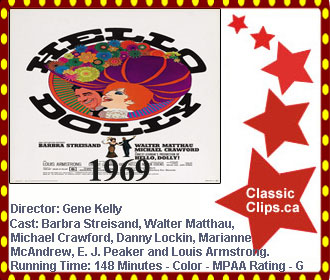 HELLO, DOLLY! (1955) In 1890s New York City, the bold and enchanting widow Dolly Levi (Barbra Streisand) is a socialite-turned-matchmaker. Her latest clients seeking assistance are the cantankerous "half-a-millionaire" Horace Vandergelder (Walter Matthau) and a young artist named Ambrose (Tommy Tune), who is in love with Horace's niece, Ermengarde (Joyce Ames). Dolly's scheming soon involves Horace's employees as well as a New York hatmaker, as she tries to cover up her own secret romantic designs. Director: Gene Kelly. Cast: Barbra Streisand, Walter Matthau, Michael Crawford, Danny Lockin, Marianne McAndrew, E. J. Peaker and Louis Armstronge. |