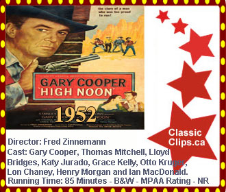 HIGH NOON (1952) Former marshal Will Kane (Gary Cooper) is preparing to leave the small town of Hadleyville, New Mexico, with his new bride, Amy (Grace Kelly), when he learns that local criminal Frank Miller has been set free and is coming to seek revenge on the marshal who turned him in. When he starts recruiting deputies to fight Miller, Kane is discouraged to find that the people of Hadleyville turn cowardly when the time comes for a showdown, and he must face Miller and his cronies alone. Director: Fred Zinnemann. Cast: Gary Cooper, Thomas Mitchell, Lloyd Bridges, Katy Jurado, Grace Kelly, Otto Kruger, Lon Chaney, Henry Morgan and Ian MacDonald. |
