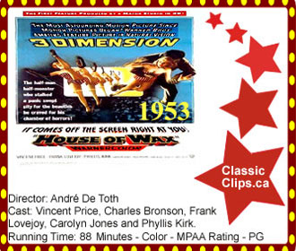 HOUSE OF WAX (1953) A sculptor of wax figures for a museum is horrified when his partner proposes setting fire to the unpopular museum in order to collect the insurance money. As the wax figures melt amid the blaze, the two men have a fight. The sculptor is knocked out in the scuffle and left to "perish" among the flames. He resurfaces many years later for the launch of his own wax museum. The opening coincides with the sudden disappearance of some dead bodies from the city morgue. His assistant begins to suspect his boss of foul play, especially after the deranged wizard of wax begins eyeing his assistant's lovely girlfriend's friend as a model for a waxed figure of Marie Antoinette. Director: André De Toth. Cast: Vincent Price, Charles Bronson, Frank Lovejoy, Carolyn Jones and Phyllis Kirk. |