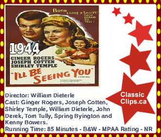 I'LL BE SEEING YOU (1944) In this romantic Christmas drama, Zachary Morgan (Joseph Cotten) and Mary Marshall (Ginger Rogers) meet on a train and immediately sense a mutual attraction. However, both Zach and Mary are shouldering significant secrets: he is a traumatized war vet on leave from a military hospital, and she is a convict who has been temporarily released from prison for the Christmas holiday. As the attractive young couple spends time together, their secrets threaten their budding relationship. Director: William Dieterle. Cast: Ginger Rogers, Joseph Cotten, Shirley Temple, William Dieterle, John Derek, Tom Tully, Spring Byington and Kenny Bowers. |