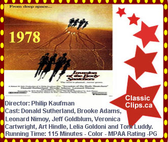 INVASION OF THE BODY SNATCHERS (1978) Health inspector Donald Sutherland is dispatched to investigate the curious behavior of several San Francisco restaurateurs. He begins to notice that even those closest to him are behaving in a detached fashion. The source of this ennui is an alien attack. Director: Philip Kaufman. Cast: Donald Sutherland, Brooke Adams, Leonard Nimoy, Jeff Goldblum, Veronica Cartwright, Art Hindle, Lelia Goldonie andTom Luddy. |