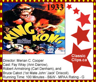 KING KONG (1933) A film crew journeys to 'Skull Island' where they discover a giant, prehistoric ape. After saving the beautiful blonde damsel, Ann Darrow (Fay Wray) from the grips of the beast (Kong), the crew then abducts the giant ape and brings him back to New York, hailing him as the 'Eight Wonder of the World'. Kong escapes, recaptures Ann Darrow, and climbs to the top of the Empire State building where he is finally shot down by war planes. Director: Merian C. Cooper. Cast: Fay Wray (Ann Darrow), Robert Armstrong (Carl Denham) and Bruce Cabot (1st Mate John 'Jack' Driscoll). |