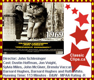 down-and-out but resilient outcast named Ratso Rizzo. The initial 'country cousin meets city cousin' relationship deepens. In their efforts to bilk a hostile world rebuffing them at every turn, this unlikely pair progress from partners in shady business to comrades. Each has found his first real friend. Director: John Schlesinger. Cast: Dustin Hoffman, Jon Voight, Sylvia Miles, John McGiver, Brenda Vaccaro, Barnard Hughes, Ruth White, Jennifer Salt and Gilman Rankin. |