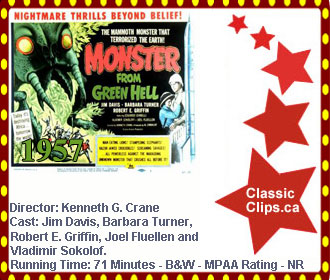 MONSTER FROM GREEN HELL (1957) Researchers (Jim Davis, Robert E. Griffin, Joel Fluellen) recover a rocketship in Africa and its cargo of now-humongous wasps. Director: Kenneth G. Crane. Cast: Jim Davis, Barbara Turner, Robert E. Griffin, Joel Fluellen and Vladimir Sokolof. |