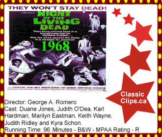 NIGHT OF THE LIVING DEAD (1968) The radiation from a fallen satellite might have caused the recently deceased to rise from the grave and seek the living to use as food. This is the situation that a group of people penned up in an old farmhouse must deal with. Director: George A. Romero. Cast: Duane Jones, Judith O'Dea, Karl Hardman, Marilyn Eastman, Keith Wayne, Jdith Ridley and Kyra Schon.. |