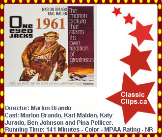 ONE-EYED JACKS (1961) After pulling a bank heist in Mexico, the outlaw Rio (Marlon Brando) and his partner, Dad Longworth (Karl Malden), make a run for it, but Dad has bigger plans than freedom. He betrays Rio and absconds with the loot, and Rio ends up in prison. Years pass before Rio finally breaks free to enact his long-plotted revenge. Tracking Dad to California, Rio learns he's become a sheriff -- which is no deterrent -- but when Rio falls for Dad's stepdaughter, Louisa (Pina Pellicer), he has second thoughts. Director: Marlon Brando. Cast: Marlon Brando, Karl Malden, Katy Jurado, Ben Johnson and Pina Pellicer. |