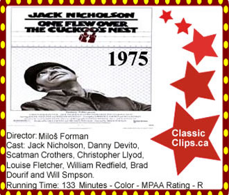 ONE FLEW OVER THE CUCKOO'S NEST (1975) McMurphy (Jack Nicholson), a man with several assault convictions to his name, finds himself in jail once again. This time, the charge is statutory rape when it turns out that his girlfriend had lied about being eighteen, and was, in fact, fifteen (or, as McMurphy puts it, "fifteen going on thirty-five"). Rather than spend his time in jail, he convinces the guards that he's crazy enough to need psychiatric care and is sent to a mental hospital. He fits in frighteningly well, and his warped point of view actually begins to cause some of the other patients to get better. Nurse Ratched (Louise Fletcher), becomes his personal cross to bear as his resistance to the hospital routine gets on her nerves. Director: Miloš Forman. Cast: Jack Nicholson, Danny Devito, Scatman Crothers, Christopher Llyod, Louise Fletcher, William Redfield, Brad Dourif and Will Sampson. |
