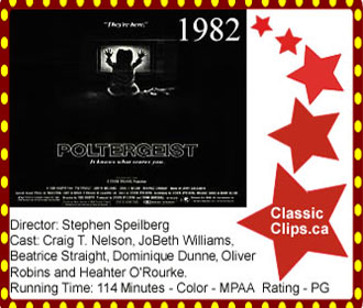 POLTERGEIST (1982) While living in an average family house in a pleasant neighborhood, the youngest daughter of the Freeling family, Carol Anne (Heather O'Rourke), seems to be connecting with the supernatural through a dead channel on the televison. Soon, the mysterious beings enter the house's walls. At first seeming like harmless ghosts, playing tricks and amusing the family, they suddenly take a nasty turn. They horrify the family to death with angry trees and murderous dolls, and finally abduct Carol Anne into her bedroom closet, which seems like the entrance to the "other side". Director: Stephen Speilberg. Cast: Craig T. Nelson, JoBeth Williams, Beatrice Straight, Dominique Dunne, Oliver Robins and Heather O'Rourke. |