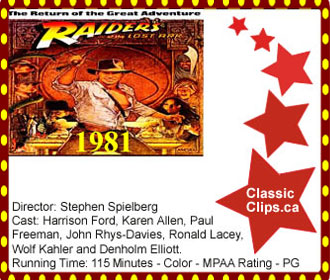 RAIDERS OF THE LOST ARC (1981) A professor who studies archeology named Inidana Jones ventures into the jungles of South America searching for a golden statue. Unfortunately, he sets off a deadly trap doing so, but miraculously he escapes. Indiana Jones then hears from a museum curator named Marcus Brody about a biblical artifact called The Ark of the Covenant, which can hold the key to human existence. Jones must now venture to vast places such as Nepal and Egypt to find this artifact. However, he has to fight his enemy Renee Belloq and a band of Nazis in order to reach it. Director: Stephen Spielberg. Cast: Harrison Ford, Karen Allen, Paul Freeman, John Rhys-Davies, Ronald Lacey, Wolf Kahler and Denholm Elliott. |